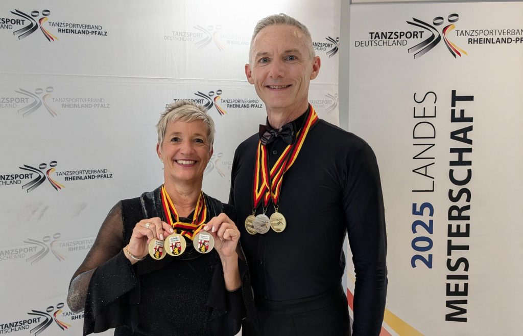 Am vergangenen Wochenende fanden in Bad Kreuznach die Landesmeisterschaften der Masters II und IV Standard statt. Bei den Mas II S traten Napoleon Wittig und Yvonne Scheller an. Unterstützt von vielen Vereinsfreunden, der Familie und dem Trainer Patrick Zimmermann gewannen die beiden souverän jeden Tanz und nahmen den Landesmeister-Titel mit nach Hause.